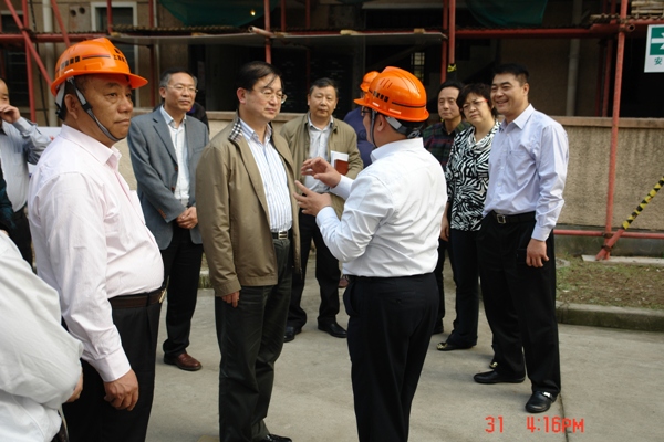 3月31日下午,上海市建设交通工作党委书记崔明华、副书记田赛男、副巡视员朱剑豪、徐汇区区委书记莫负春、副书记王醇晨、政法委书记郭俭、副区长徐建、区建委书记夏颖秋,及市、区铁路上海南站噪声治理工程工作组领导等一行在四建集团党委委员、工会主席王正龙等的陪同下,亲临“凌云新村、梅苑一居”铁路上海南站噪声治理住宅修缮施工现场视察调研,指导工作。项目经理潘建国代表四建集团项目部向市、区领导现场作前期准备、施工进度、后续安排三方面的工作报告。市、区领导对四建集团项目部为降噪工程所做的工作给予了充分的肯定。